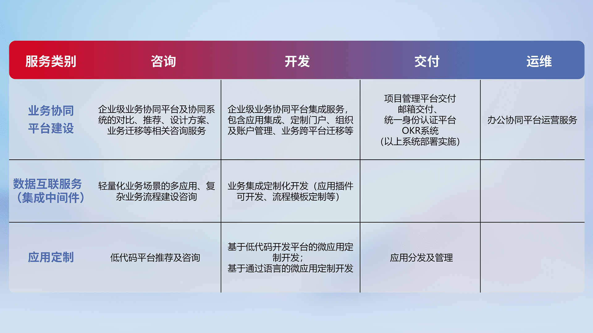 针对钉钉、、、、企微、、、IDaas等平台级产品提供产品的规划、、、方案、、、、交付、、、、定制化开发等服务,,实现如统一协同办公、、、智能客户服务、、、混合会议管理、、智能数据查询、、等业务场景,,,,实现数字化转型。。。